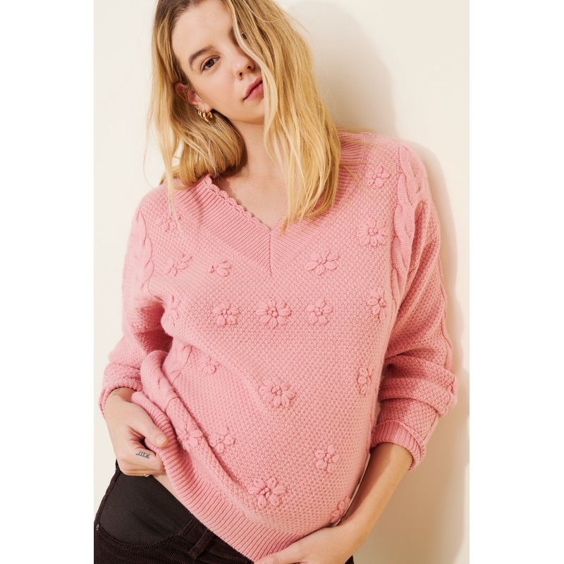 Wrap yourself in cozy elegance with this luxurious wool sweater, designed with a beautifully textured floral pattern and a flattering V-neckline. Its versatile pullover styling makes it an easy choice for layering or wearing solo.