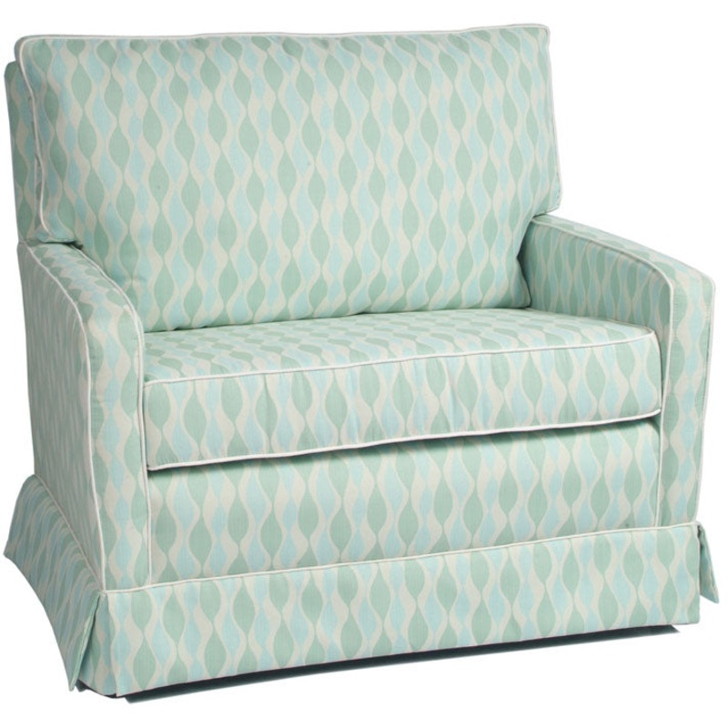 The name says it! Like a mini loveseat, this glider if perfect for parents having their second child. Siblings can snuggle next to mom and baby while smoothly gliding. This chair does not swivel. It has an attached pillow back, reversible seat cushion.