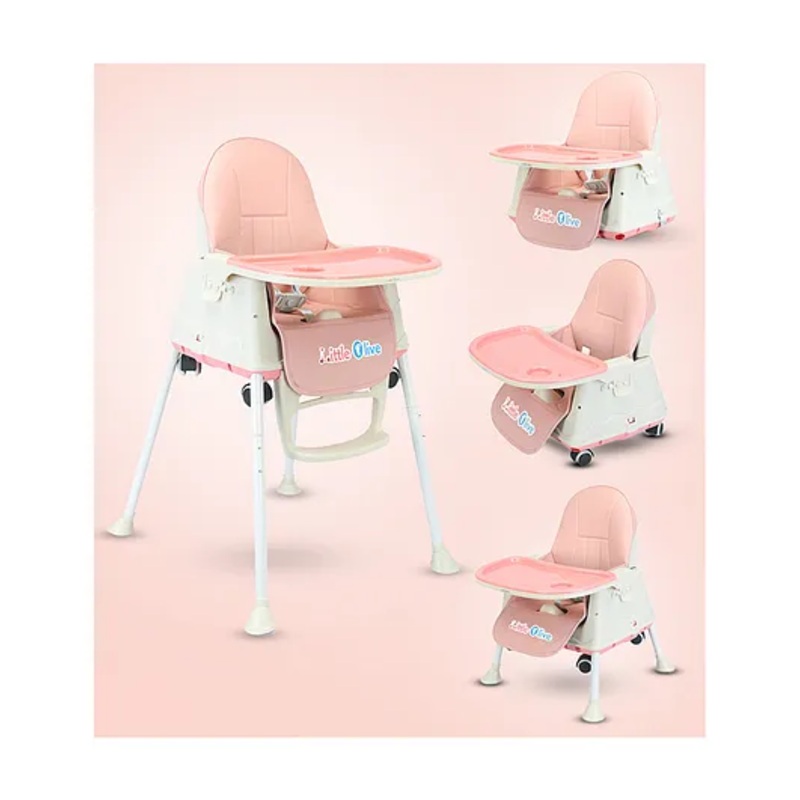 Safety Harness Secure 3 point safety harness ensures a safe meal time seatingAdjustable Chair The chair can be adjusted upto 4 positions for child comfort Removable Child Tray The tray can be adjusted as per convince and isis detachable and washableWheels Smooth wheels for easy movement and haltingMaterial The legs of seat are made of firm metal and rubberFootrest The footrest can be adjusted as per baby’s convenienceCushioned Seat pad Seat pad is removable and washable for hygieneCompact fold Folds compactly for easy storageSpecificationsBrand – Little OliveType – High ChairAge – 6 Months to 3 YearsBody SpecificationsSafety Harness YesAdjustable height – YesAdjustable dining tray – YesDetachable dining tray – YesRemovable & washable seat pad – YesCompact fold – YesTechnical Specifications Overall dimensions – L 62 x B 54 x H 87 cmBox Dimensions – L 44 x B 39 x H 25.5 cm(Good to know)Seat Dimension – L 29 x B 23 x H 33 cmCarrying Capacity – 15 kgWheels Diameter – 5 cmWeight – 3 Kg 535 gProduct DescriptionMake meal time safe and comfortable for your child with This Little Olive High Chair. The high chair features adjustable 3 position dining tray and 4 position reclining seat. 3 point safety harness keeps the child secured in one place. Adjustable height helps you adjust the shoulder strap as per your child’s height. Front and back wheels for easy movement and halting. The food tray is detachable and washable. The seat pad is removable and washable for hygiene. Compact fold helps you to store the high chair easily when not in use.Items included in the package1 High ChairProduct Video