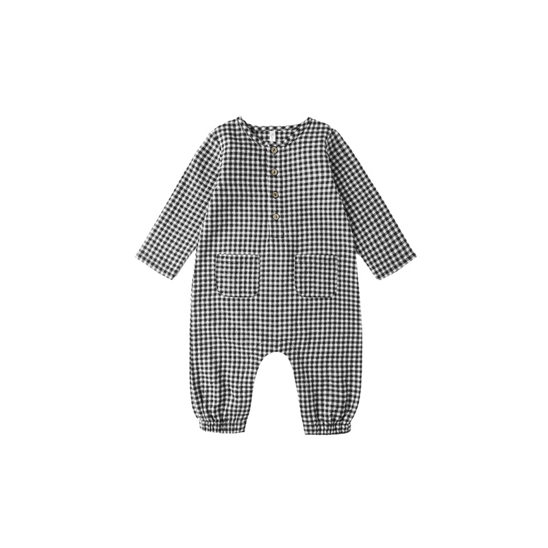 Long Sleeve Woven Jumpsuit featuring front pockets, coconut buttons down the chest, and hidden snaps along the inseam for easy changes. Elasticized leg openings ensure a comfortable, secure fit.Featuring our 'black gingham' print.Care: Machine wash cold. L