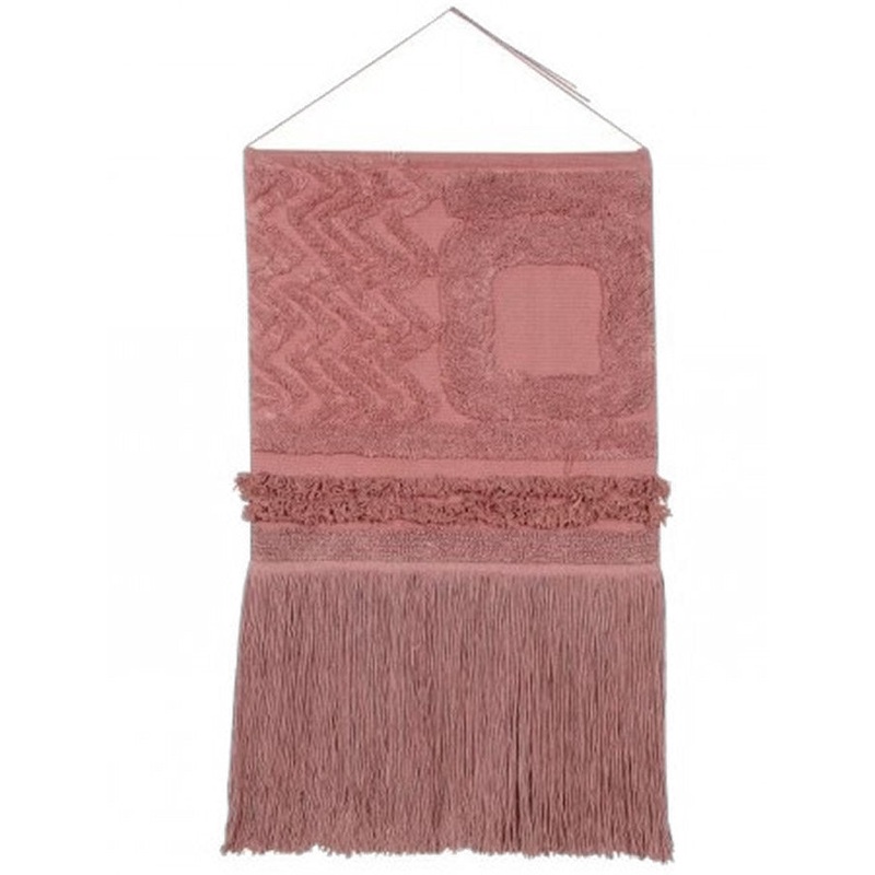 Synonymous with style and elegance in Rosa. Give a different touch to your stay with the Early hours wall pendant! A base of canavas with different textures and large cotton fringes at the bottom. SIZE: 1′ 8” x 2′ 10”