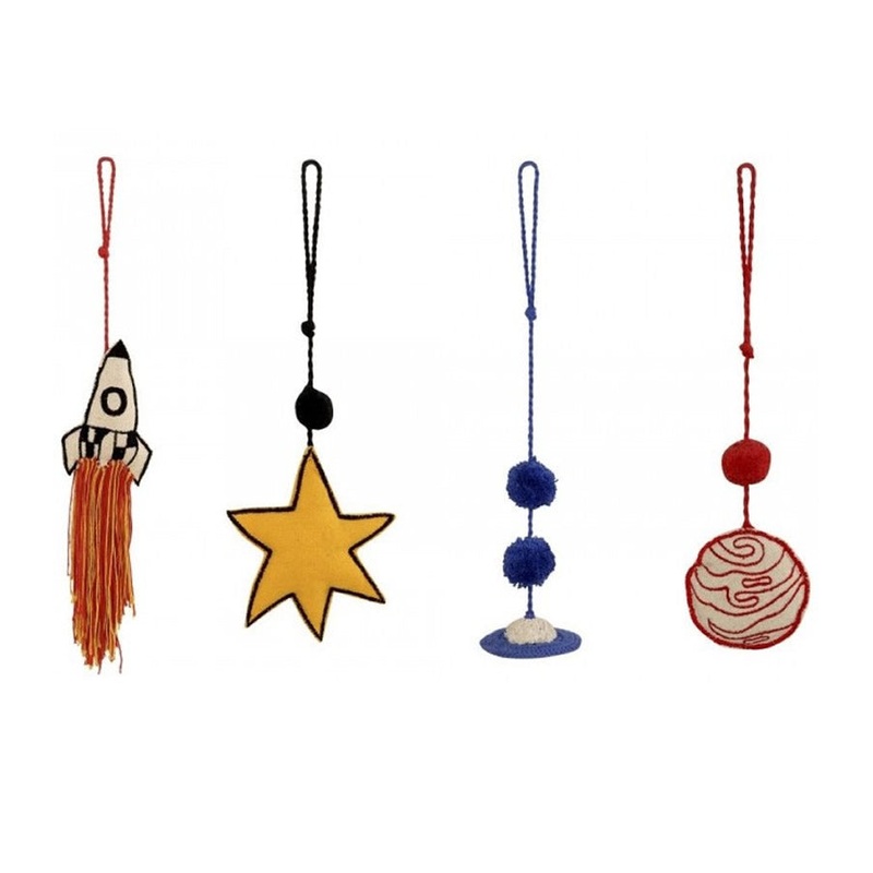 The Galaxy door hangers bring a thrilling journey into space right to your home! Each of the four hangers consists of a small cord with a mini-cushion from the Galaxy collection hanging from it (a yellow star, Saturn, Mars and a rocket). The mini-cushions have a tightly woven cotton exterior (with 100% polyester filling) and embroidery in a variety of colors provides realism. The hangers can serve as both decoration and playful tool to teach children colors and shapes. They are 100% cotton and hand-crafted with natural dyes. Discover the entire Galaxy collection of rugs, cushions and wall decor! SIZE: 1′ 5″ x 3″