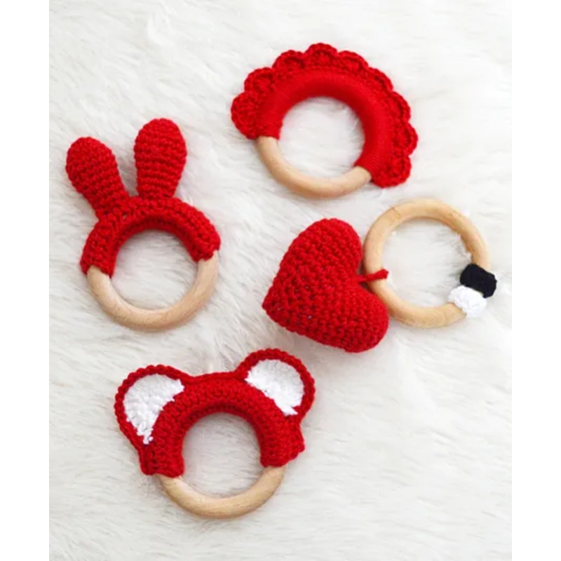 Love Crochet Art Set of 4 Teether Wooden Ring – Red – Height 9 cm