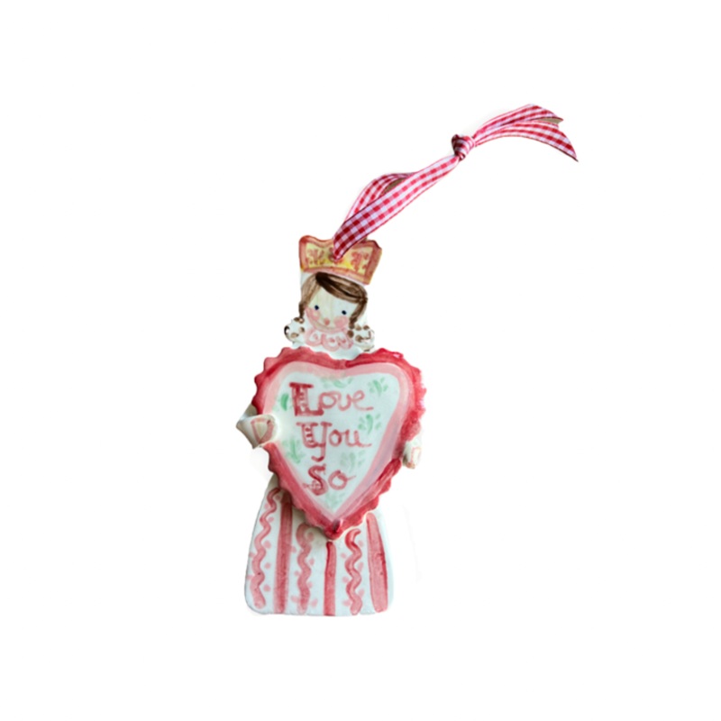 Self-taught artist Tricia Lowenfield crafts one-of-a-kind whimsical pieces that enliven any household and will become family treasures. Express the joy of love this Valentine's with the Love You So Girl with Crown Ornament, which adds sentiment and decor t