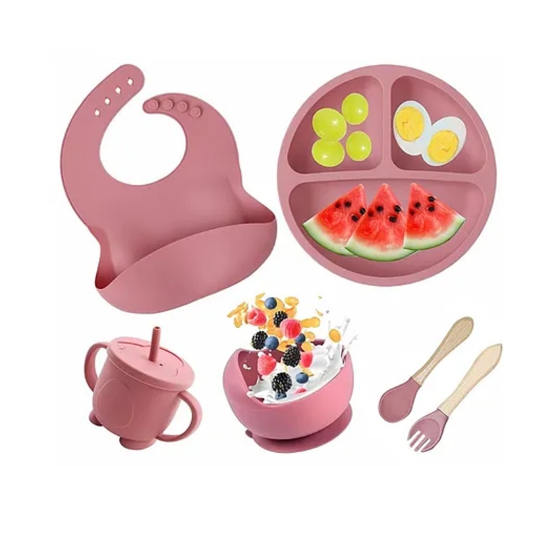 Luvlittle 6 Pcs Silicone Baby Feeding Set, BPA Free & Microwave Safe Dinner Tableware Kit – Feeding Bowl, Suction Plate, Cup, Spoon, Fork & Bib for Kids, Toddler -dusty pink-Colour and Design May Vary