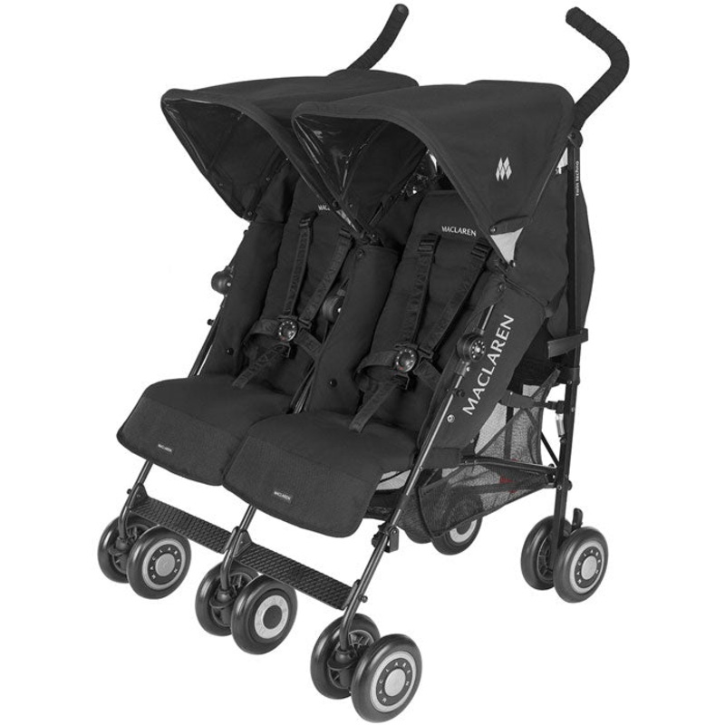 The Maclaren Twin Techno 2010 Double Stroller combines superior comfort, performance and room for two with sporty style. The Twin Techno offers the best from Maclaren including a five-point harness and foot-operated parking brakes that provide maximum safety and security. The five position, independent reclining seats and adjustable leg rests make riding in the Twin Techno more comfortable for your growing children. The Twin Techno has lockable front swivel wheels with reflective hub caps, front wheel suspension and height adjustable, ergonomically designed foam insulated handles that make it easy for you to navigate through shopping malls, parks and your neighborhood. Additionally, the compact design of the Twin Techno allows you to easily pass through any regular-sized door. The Twin Techno comes fully loaded, including under-seat baskets, sun canopies, rain cover, and infant pillow sets. There is a carry handle to make the stroller easier to carry when folded.