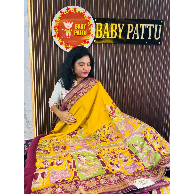 NY76387088Mango Yellow Kalamkari Pure MUL MUL Cotton Saree