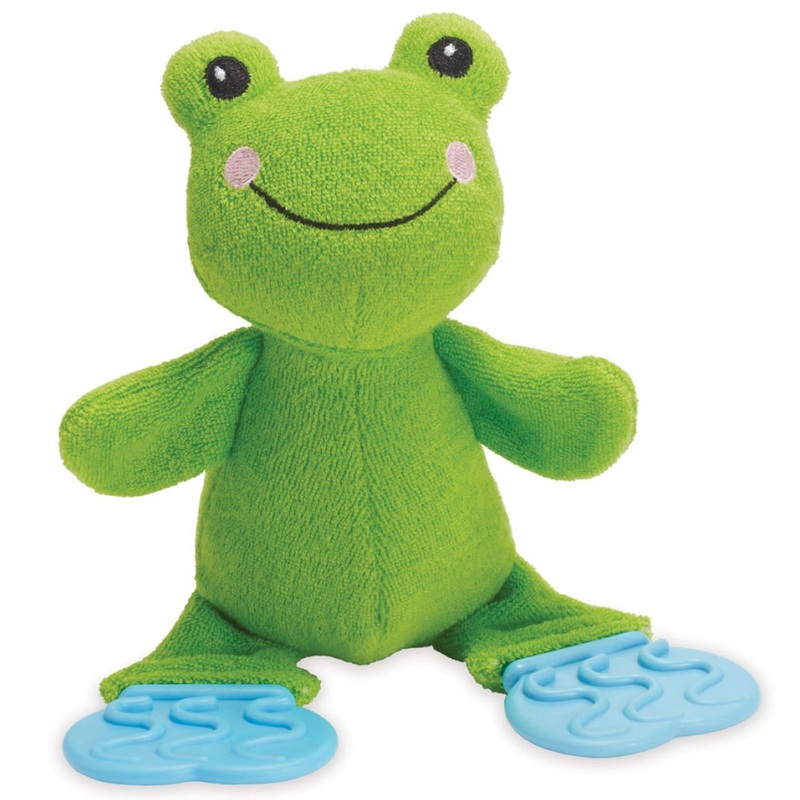 This cuddly frog comforts and soothes teething babies with its textured teethers and soft, colorful fabric. 3+ months. Machine-washable.
