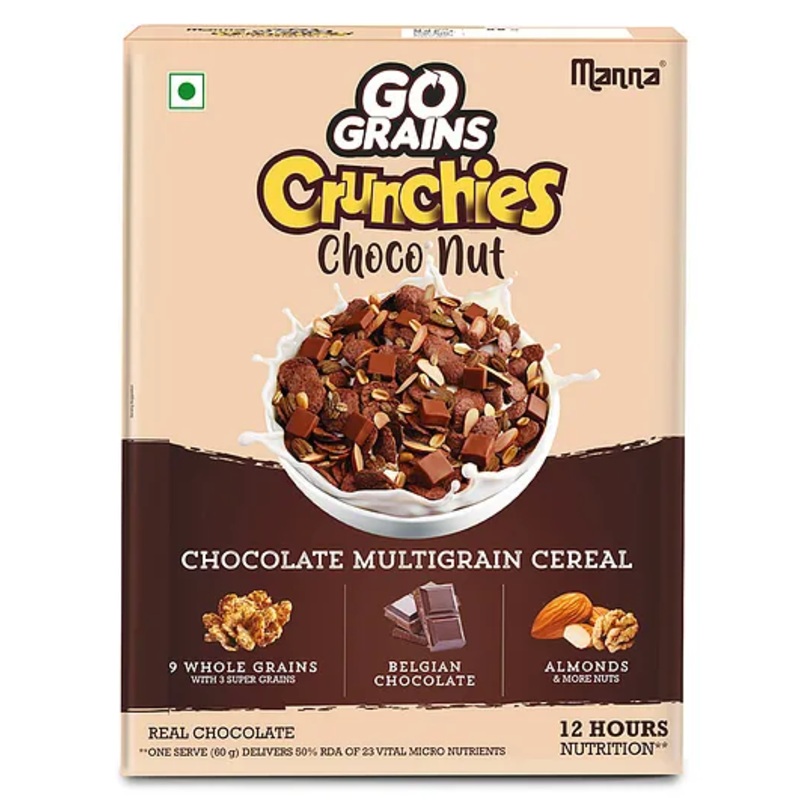 Multigrain Cereal, Contains 3 Super Grains, Real Belgian Chocolate, Ensures 12 hour nutrition, One serve gives 50% RDA.Specifications -Brand – MannaType – Breakfast CerealAge – 5+ YearsWeight – 450 gProduct DescriptionCRUCHIES STAYS CRUNCHY even in hot milk. Kids will now never say no to Milk, the tastiest crunchiest milk .BE STRESS FREE with 12 hour nutrition. In every serving (60g), your kid gets more nutrition than required in one school dayMILLETS, OATS & SUPER GRAINS Wheat, Jowar, Bajra, Ragi, Kodo Millet, Barnyard Millet, Quinoa, Amaranth, MaizeCRUNCHIES IS LOADED 16 % Real Belgian Chocolate & 15% Nuts (Almonds, Peanuts & Walnuts)NATURAL INGREDIENTS. No Maida, No added color, No aritifical additives.Items Included -Multigrains 36.5% (Oats, Wheat, Jowar, Bajra, Ragi, Kodo Millet, Barnyard Millet, Quinoa, Amaranth, Maize), Brown Sugar, Nuts 15% (Almonds, Walnuts, Peanuts), Milk Chocolate 8%, Dark Chocolate 8%, Soya Granules