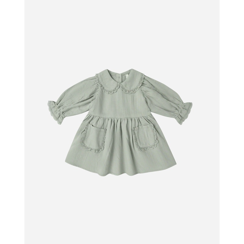 Our Marisol Dress features a Peter Pan collar, patch pockets, and full gathered sleevesall adorned with delicate lace ruffle trimand coconut buttons at the back for easy dressing. Coordinating bloomers included with all sizes.Featuring our 'fern' hue.Care: