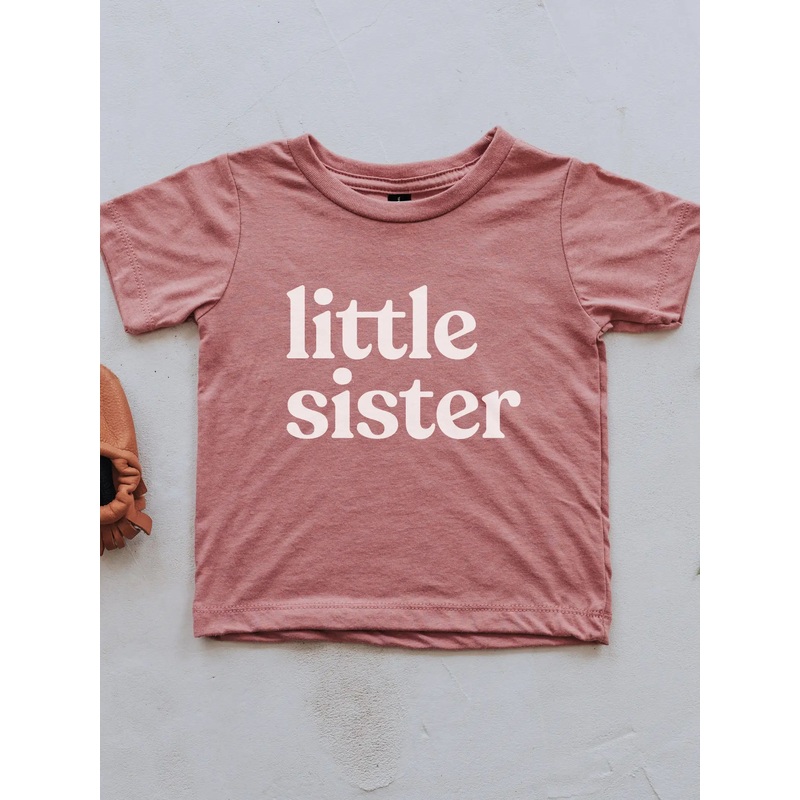"Little Sister". Share sibling pride in style! This sweet kids shirt features trendy typography in white ink on super soft tri-blend mauve fabric. Designed with love and printed by hand in our Ohio workshop.