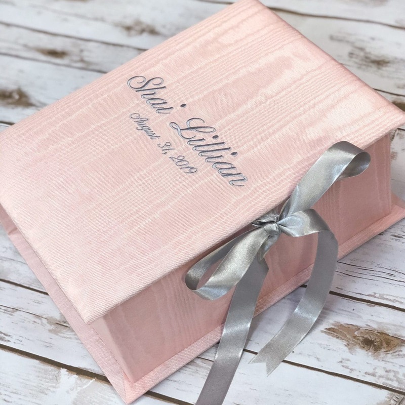 Safeguard your unique memories with our Baby Moire Fine Fabric Medium Keepsake Box. Each box has a wavy, watered appearance, making every cut unique, just like your memories. Available in various moire colors, this box measures 10 x 14 x 5 and features an
