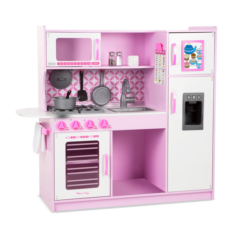 Budding young chefs can hone their craft in this beautifully designed, pretty pink modern play kitchen! The easy to assemble chef's kitchen includes a refrigerator/freezer with working ice maker that dispenses two included "ice cubes," an oven and stovetop