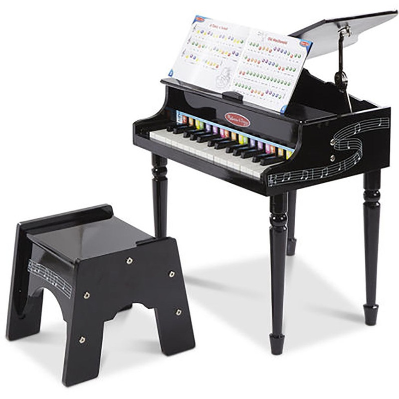 Classically-styled grand piano from Melissa and Doug features a lifting top with safety hinge, 30 piano keys, songbook with color-coded key chart and a sturdy, non-tip bench!