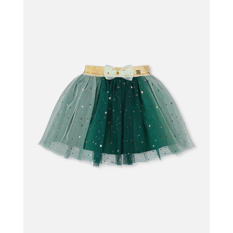 Our Mesh Skirt With Bow Forest Green is made for twirling through the magic of the season. This pleated mesh skirt features a soft ombr fade, a glittery allover star print, and a gold elastic velvet waistband with a statement bow. Pair it with any top or s