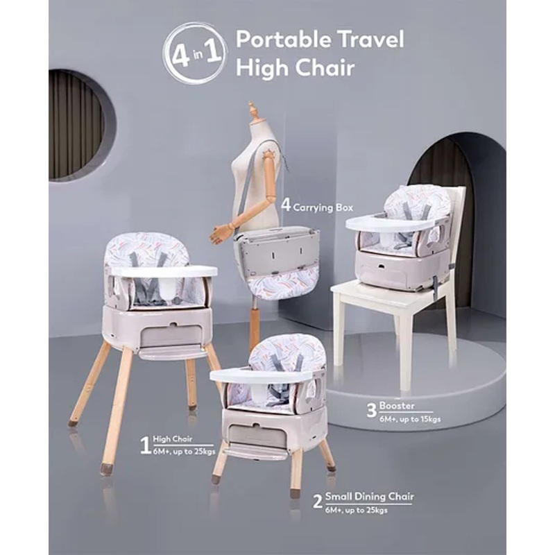 Multi-functional 4-in-1 foldable & easy-to-carry baby chairEffortlessly transforms from a high chair to a small dining chair, box & booster seat (for seamless attachment to any dining chair)Lightweight and sturdy, it comes along with an easy assembly instr