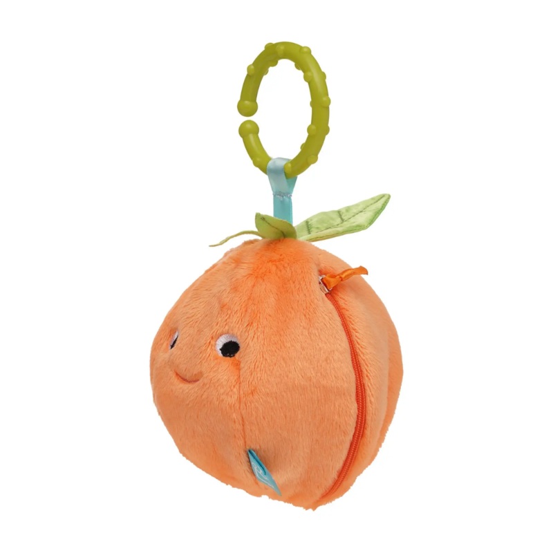 Fruity fun for little ones on the go! This orange travel toy has embroidered facial features and a zippered compartment that holds three soft fabric orange slices. Tethered by silky-soft ribbons, each slice include three unique features - rattle, squeaker