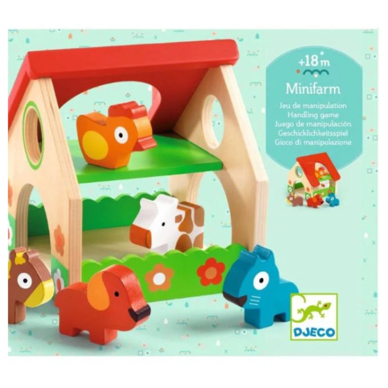 A beautifully decorated miniature wooden farm with 5 animals: a dog, a cat, a horse, a cow, and a chicken. A developmental toy designed to stimulate the imagination of children 18 months and up.Contents: 1 farm and 5 wooden animals.Measurements: 5.71 x 6.6