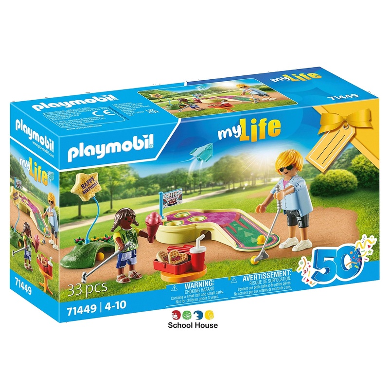 Miniature golf course with three hitting holes and golf fans.Endless play fun awaits Mini Golf fans with the fantastic PLAYMOBIL Mini Golf Gift Set. Thanks to the decorative packaging that can be personalized with the birthday child’s name, you save on gift wrap.The Mini Golf course offers plenty of excitement: the front area allows for the perfect ball placement for tee-off, while on the upper level, three additional holes serve as targets. The passage beneath the course can double as a tunnel, and the hill serves as an extra challenge. In the two-part container, you can store the sweet waffle hearts, while the golf clubs, paper airplane, ice cream cone, beverage cup, and balloon string have practical handles and can be held by the figuresFigures: 1 man, 1 child; Accessories: 1 balloon, 2 waffles, 1 toolbox, 1 table, 1 ice cream, 1 flag, 3 golf balls, 2 golf clubs, 1 cupWarning!Choking hazard! Contains a small ball and small parts. Not for children under 3 years.Product dimensions:3.94 x 1.97 x 0.59 inAge:4 years and up