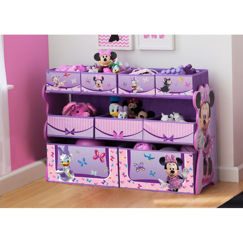 Bring a spot of color to your girl's bedroom or playroom with this Minnie Deluxe Multi-Bin Organizer from Delta Children! Featuring nine uniquely sized fabric bins supported by a sturdy wood frame, it's finished with colorful illustrations of Minnie Mouse