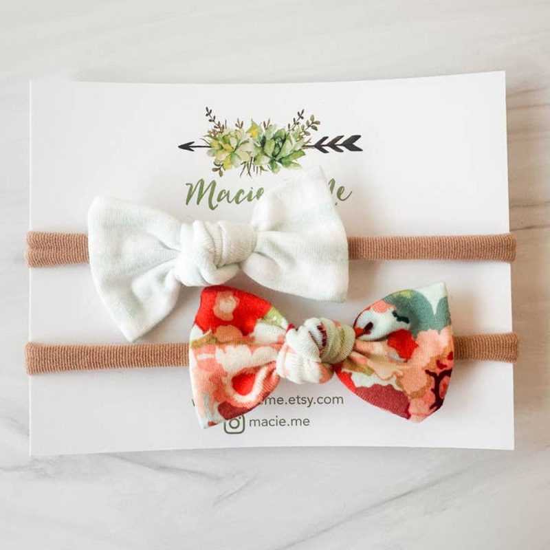 These bows are perfect to gift to a new mom and her baby. They are soft and come on a one size fits all headband. Bows come packaged as pictured and in a clear resealable bag.