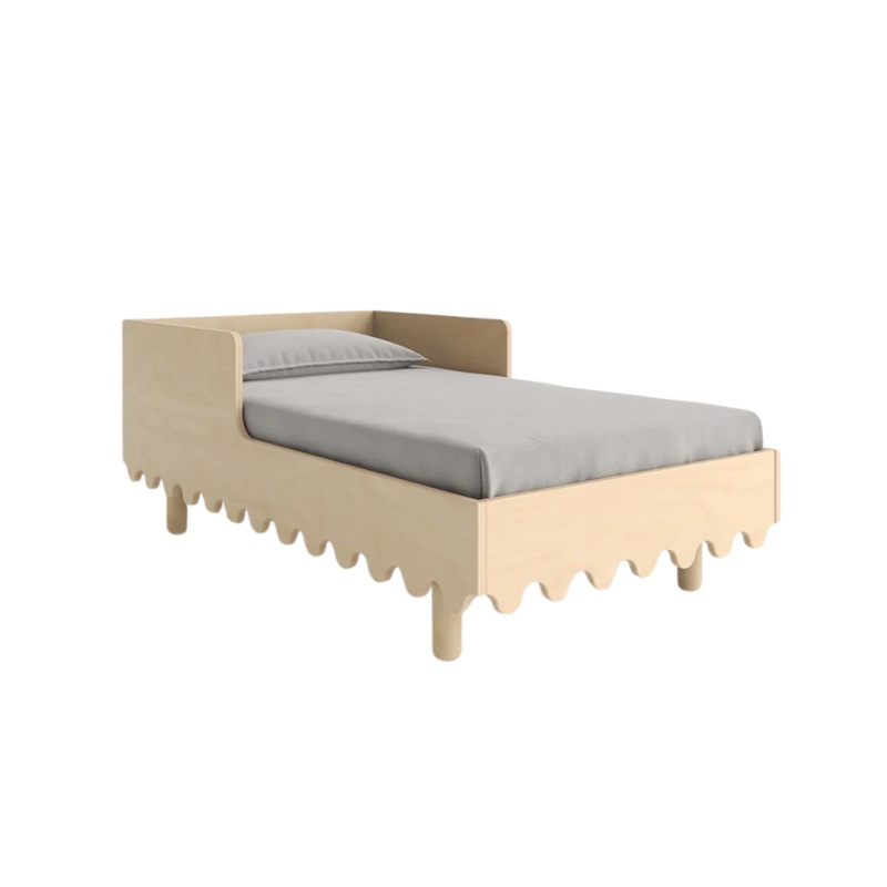 Want to celebrate the milestone of moving to a big kid bed with a stand-alone toddler bed? The Oeuf Moss Toddler Bed features a bold-yet-simple wave motif thats an instant statement in any room. It uses a standard crib mattress and sleeps comfortably for children up to age 6.