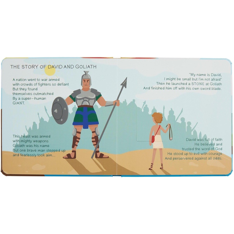 Babys first board book Bible with lift-the-flap pages includes stories of — Adam and Eve, Noahs Ark, Jonah and the Whale and David and Goliath.