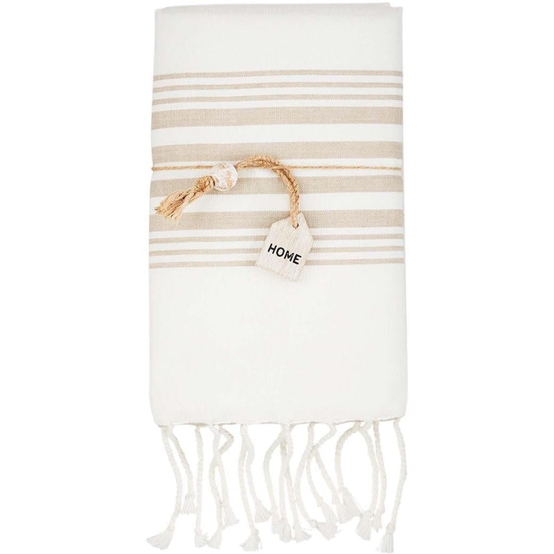 Set of two striped woven cotton Turkish towels feature twisted tassel trim. Towels arrive bound with cording and mango wood house tag.
