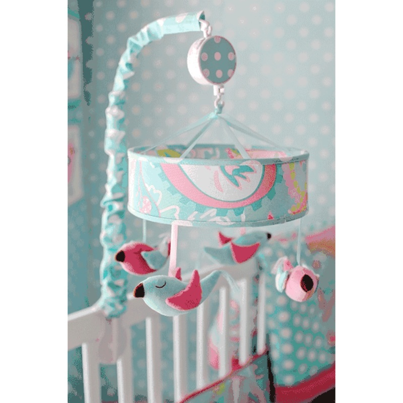 Fun aqua & pink plush birds hang from this musical rotating mobile. Wind up mobile plays Brahm's Lulluby, measures 24'' by 11''.