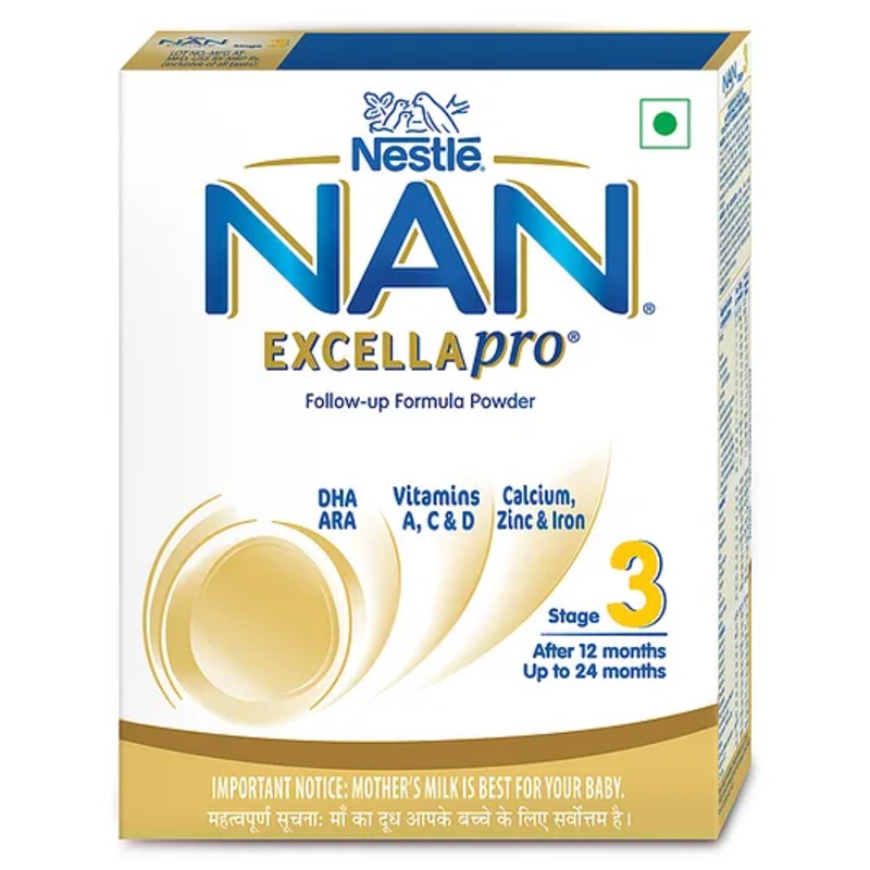 - Mother’s milk is the best for your babySpecificationsBrand – NestleType – Nan Excellapro 3 Nutritious Milk DrinkAge – After 12 Months Upto 24 monthsQuantity – 400 gmIngredientsMilk solids, Maltodextrin, Soyabean oil, Low erucic rapeseed oil, Minerals, High oleic sunflower oil, Coconut oil, Sunflower oil, Emulsifier (Soya lecithin) , Arachidonic acid (ARA) from Mortierella alpina oil, Docosahexaenoic acid (DHA) from Schizochytrium sp. oil, Vitamins, Acidity regulators (Citric acid and Potassium hydroxide) and Packaging gases (Carbon dioxide and Nitrogen).Contains Milk, Soy.Nutritional InfoPer 100 g of PowderEnergy – 469 KcalProtein- 14.1 gTotal Sugar- 35 gTotal Fat – 19.5 gCholestrol – 10 mgProduct DescriptionNestl NAN EXCELLAPRO 3 is a spray dried follow-up formula with DHA, ARA, Vitamins A, C, D, Calcium, Zinc and Iron for infants after 12 months and up to 24 months when they are not breastfed. Nestl NAN EXCELLAPRO 3 contains DHA. DHA helps support normal brain development. Also contains Iron. Iron helps support normal cognitive development. Contains Vitamins A, C and Zinc. Vitamins A, C and Zinc contribute to normal immune system function. Contains Calcium and Vitamin D. Calcium and Vitamin D help support normal growth and development of bones. 155 years of expertise in Infant Nutrition Nestl develops infant nutrition products backed by evolving science and research. Innovation has been at the heart of Nestl since its beginning. Nestl agrees with the World Health Organization and other medical and health associations that breast milk is the best and the most natural food for babies. Important Notice Mother’s milk is best for your baby.Usage Directions Step 1 Wash your hands carefullyStep 2 Boil bottle, bowl and spoonStep 3 Boil drinking water and allow to coolStep 4 Consult feeding table, pour exact amount of previously boiled water into bottle. Please look for ml markings on bottleStep 5 Consult feeding table and add exact number of leveled scoops for age of baby. Shake bottle well to dissolve powderStep 6 Feed baby with bowl and spoon. Discard leftover feedStorage ConditionsOn opening, transfer the contents of the pack along with the pouch into a clean airtight container.After each use, replace lid tightly and store in a cool, dry and hygienic place.Warning & CautionUnboiled water, unboiled utensils or incorrect dilution can make your baby ill. Incorrect storage, handling, preparation and feeding can potentially lead to adverse effects for the health of your baby.Only prepare one feed at a time. Feed immediately and follow the instructions exactly. Boiled and cooled water shall be used to prepare this product and any leftover product must be discarded to reduce the risk of infection. Always hold baby while feeding. Leaving baby unattended may cause choking. Infant food should be used only on the advice of a health worker as to the need for its use and the proper method of its use. Infant food is not the sole source of nourishment of an infant. “Infant food shall be introduced only after the age of six months and up to the age of two years.”Consult your healthcare professional before introducing any new food to baby’s diet. If an earlier introduction of new foods is recommended by your healthcare professional, reduce formula intake as advised. Use only enclosed scoop. Do not change proportions without medical advice.Careful and hygienic preparation of infant milk substitute is most essential for health. Do not use fewer scoops than directed, since diluted feeding will not provide adequate nutrition needed by your infant. Do not use more scoops than directed, since concentrated feed will not provide the water needed by your infant. Retain the feeding table \ instructions given on this pack.Ensure enclosed scoop is washed and thoroughly dried before use. After opening use the contents within 3 weeks or the USE BY date, whichever is earlier.Important Notice Mother’s milk is best for your baby.Items Included in Package400 g Nan Excellapro 3 powderCustomer Care [email protected]; Toll Free Number1800-103-1947