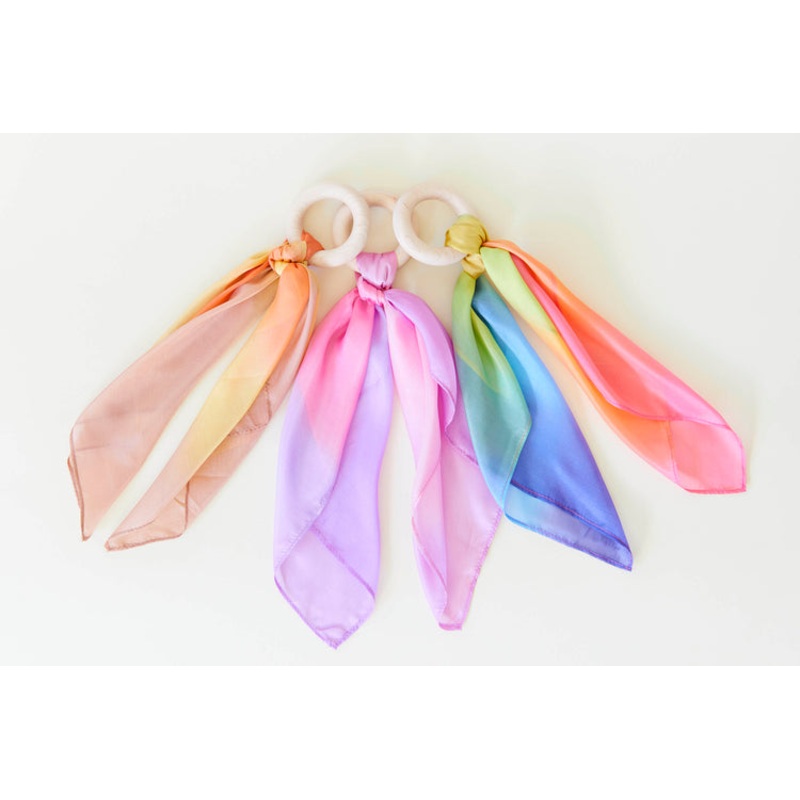 The blossom baby teether is a 3" diameter solid maple wood ring with a 21" x 21" mini blossom playsilk securely knotted onto it. - Nourishing the senses with baby teethers is an amazing tactile experience, babies are able to grasp the ring easily and enjoy