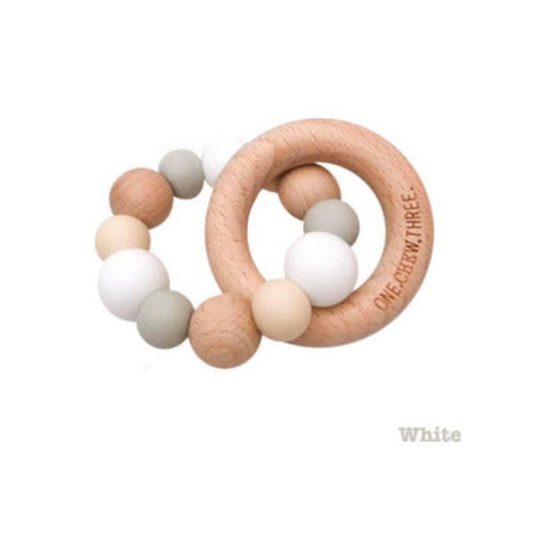 The soft, chewable silicone ring soothes and massages sore gums and a hard, natural beech wood ring provides greater relief and assists teeth to break through that last layer of gum. And those cheeky wooden beads not only make a rattle sound against the wood ring, it’s a great new texture for bub to find while chewing away.