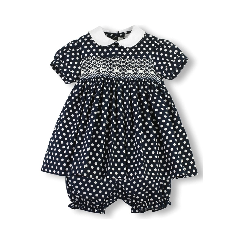 Introducing our Navy Polka Dot Baby Girl Dress with Panty, a charming addition to your little one's wardrobe. Crafted with care, this dress features a classic navy blue color adorned with playful white polka dots, exuding timeless elegance and sweetness. M