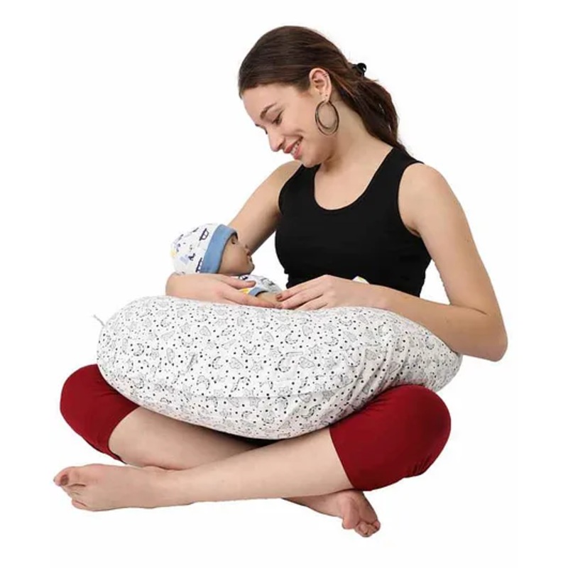 The nursing pillow is filled with 100% polyester. The cover is 100% cotton polyester that make it portable, soft and light.Pillow is allergen protected and smooth cover protects your baby's skin from irritationMachine washable pillowMultipurpose and can be