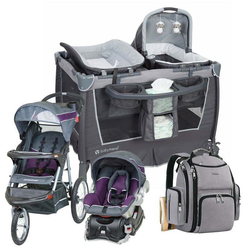 New Baby Jogger Stroller Travel System with Car Seat Playard Nursery Diaper BagThe Baby Trend Expedition Travel System comes complete with a 3-Wheel Jogger and EZ Flex-Loc Infant Car Seat with lock in car base. The stroller features a lockable front swivel