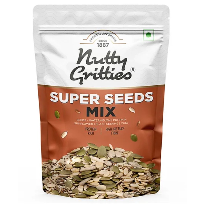 A delectable mix of crunchy, roasted seeds Flax Seeds, Sunflower Seeds, Pumpkin Seeds, Watermelon Seeds, Sesame Seeds & Chia Seeds.Taste- Fresh, Crunchy, Slightly nutty texture.High in dietary fibre- approx 18g in 100g Super Seeds Mix- Improves your digest