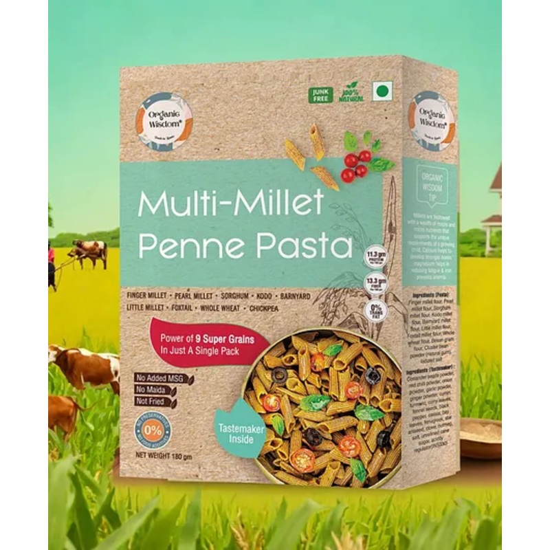 1.Multi Millet Penne Pasta 180g pack is having a rich nutrition profile. It’s a combination of major and minor millets making it rich in protein, calcium, iron and fiber.2. Net weight – 180g (tastemaker inside, which can be added as per the preferred spice level).3. Multi Millet Penne Ingredients – Finger millet flour, Pearl millet flour, Sorghum millet flour, Kodo millet flour, Barnyard millet flour, Little millet flour, Foxtail millet flour, Whole wheat flour, Besan gram flour – Tastemaker – Curated from the blend of ayurvedic spices to help digestion and build immunity.4. Millet pasta is a healthy choice, free from maida, MSG, refined oil, trans-fat, and food additives. These are made using traditional methods of sun drying, making them a healthier food choice.5. Ingredients are sourced from the farmers indulge in natural farming and food is traditionally processed to keep the nutrients intact.6. Millets are known as harsh weather crops which means they need lesser water compared to rice, less water results in lesser use of pesticides making them organic in nature.7. Freshly packed – Shelf life of 12 months from the date of manufacturingSpecificationsBrand name – Organic WisdomType – Multi Millet Penne PastaAge – 12 Months+Quantity – 180 GramsProduct DescriptionIntroducing Organic Wisdom’s Multi Millet Penne Pasta, free from Maida, MSG, and unhealthy additives. Crafted with premium organic ingredients, solar-dried for wholesome nutrition. A delicious, guilt-free choice for your family’s well-being.Items Included In the PackageMulti-millet penne pasta along with a tastemaker.”
