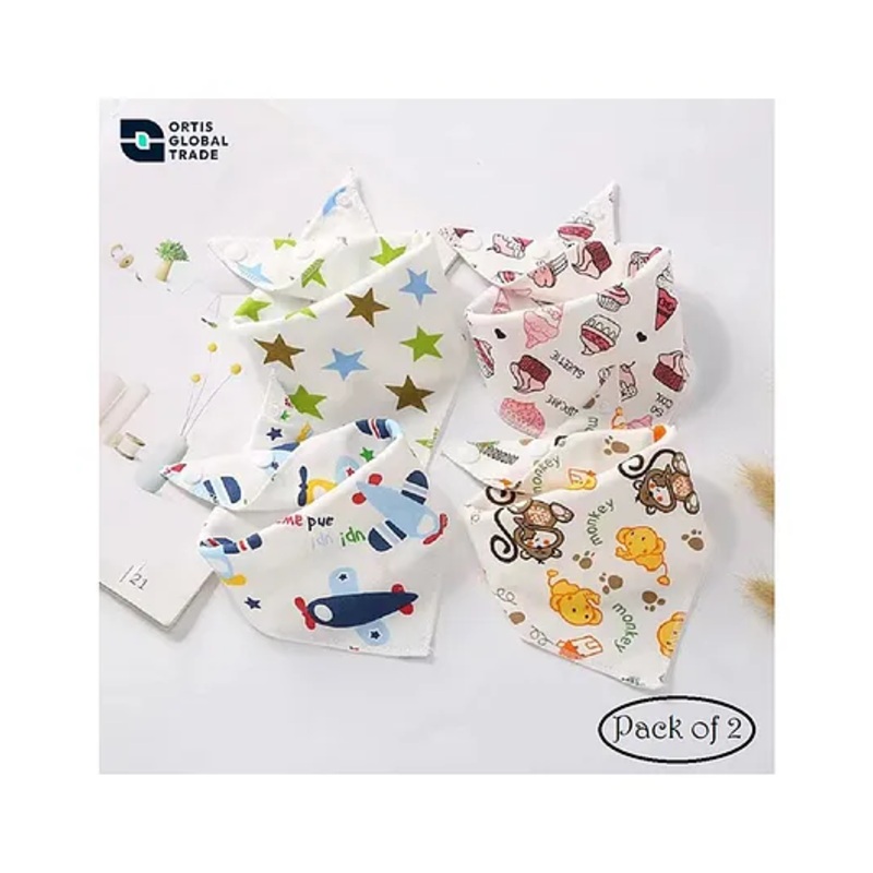 Ortis Cotton Baby Bib, Triangular Scarf with 2 Adjustable Press Studs – Pack of 2 (Color & Design May Vary)