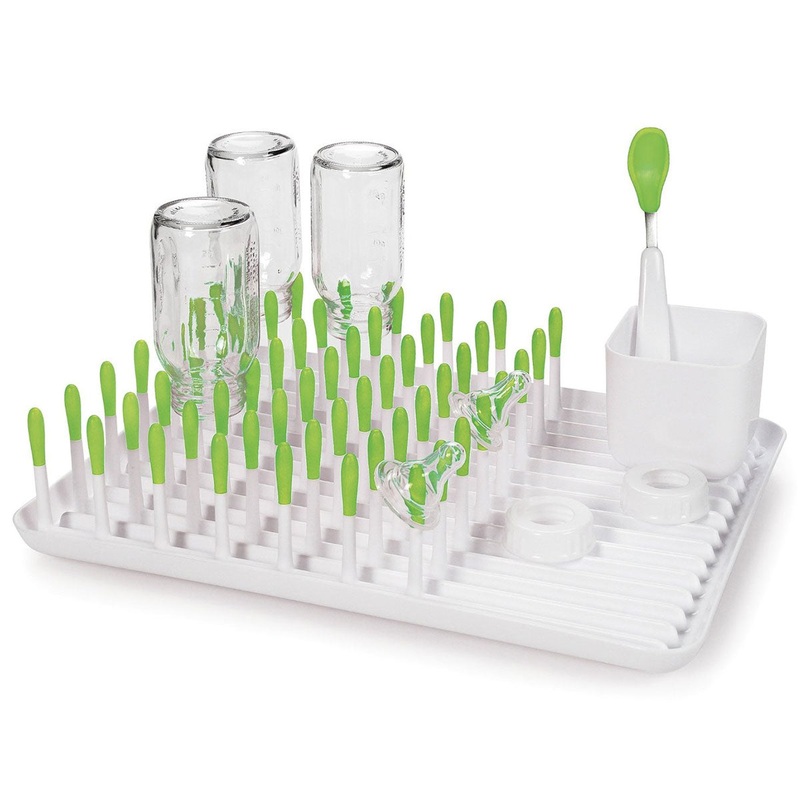Keep bottles elevated, secure and upright with the OXO Tot Bottle Drying Rack. The Drying Rack accommodates at least eight bottles and corresponding parts. Raised ribs on the bottom of the tray ensure items dont sit in a pool of water, keeping them clean, sanitary and dry. Additional space at the front of the Rack is useful for small parts. A removable cup can be attached to multiple areas of the tray and is ideal for kids utensils, straws and medicine droppers. The corners of the tray are optimally shaped to easily pour out excess water, and elevated non-skid feet at the bottom of the tray make it easy to lift.