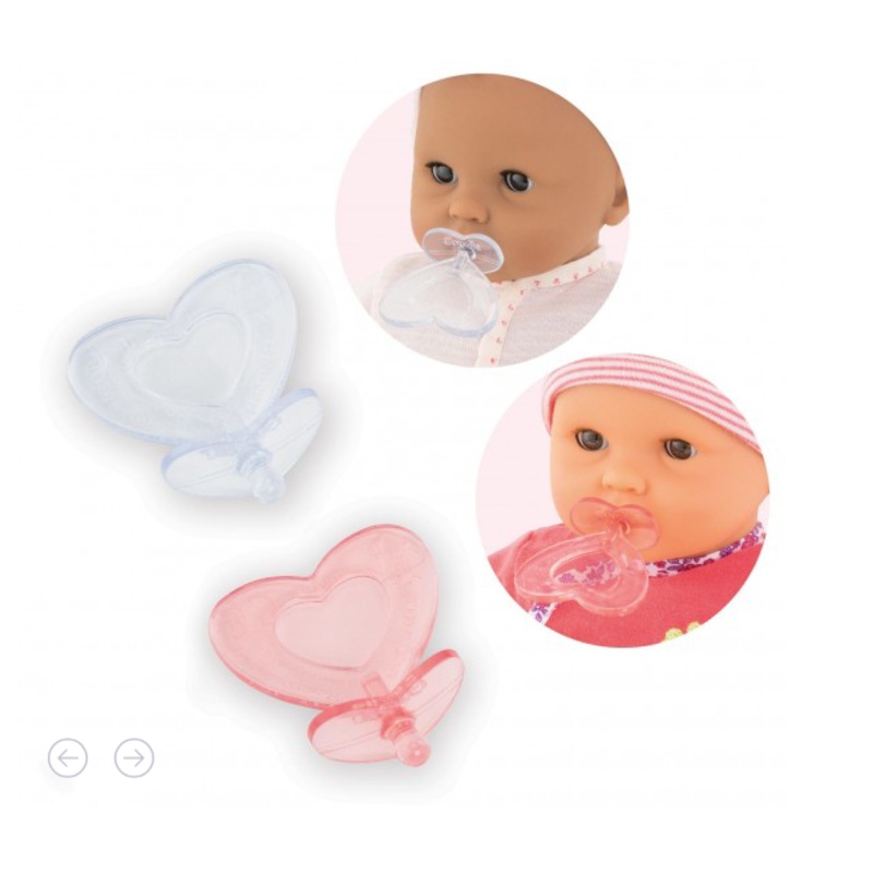 Pacifier Set 12" DollThis set of 2 pacifiers (1 pink, 1 grey) is essential to stop the tears and soothe a favorite 12-inch mon premier poupon Corolle baby doll. The pacifiers are part of the mon premier poupon Corolle collection of dolls, fashions and acce