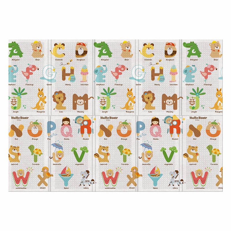- Double-sided design: Two mats in one! Change your design anytime you want by flipping your mat over to the other side. Features Hello Bear Alphabet on one side, and grey chevron on the reverse side.