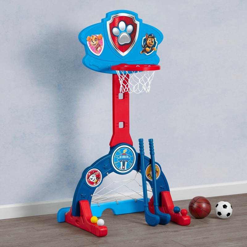 Game on! Tiny sports fans will love this PAW Patrol 4-in-1 Sports Center by Delta Children. Designed to keep your little one active and entertained, this activity center features a basketball hoop, soccer/hockey net and golf game (basketball, soccer ball,