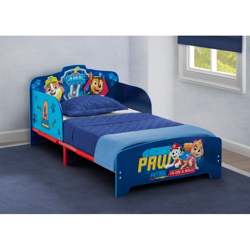 The playful PAW Patrol Wood & Metal Toddler Bed by Delta Children is designed to deliver pleasant dreams. Adorned with colorful graphics of Marshall, Rubble, Skye and Chase, this sturdy wooden toddler bed with metal and fabric mattress support will help yo