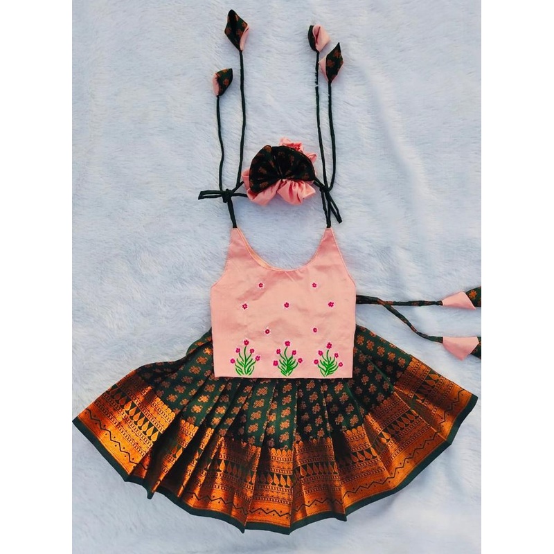 Peach & Dark Green Pattu Pavada
