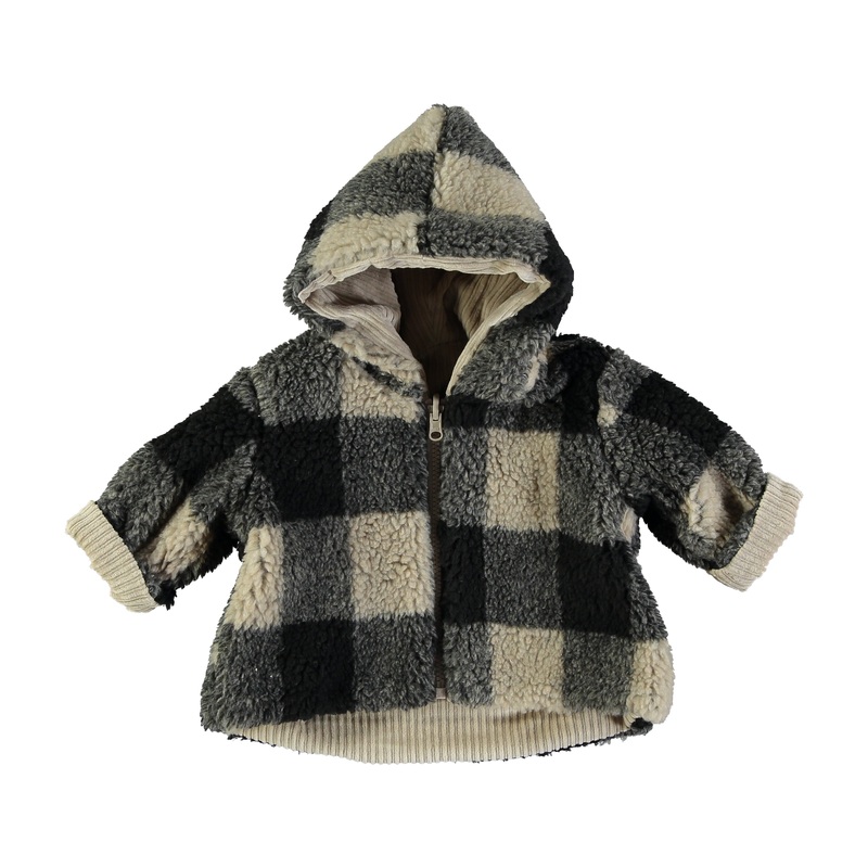 Petit Indi (Made in Spain) – Reversible Fleece Coat – Charcoal Plaid + Fawn