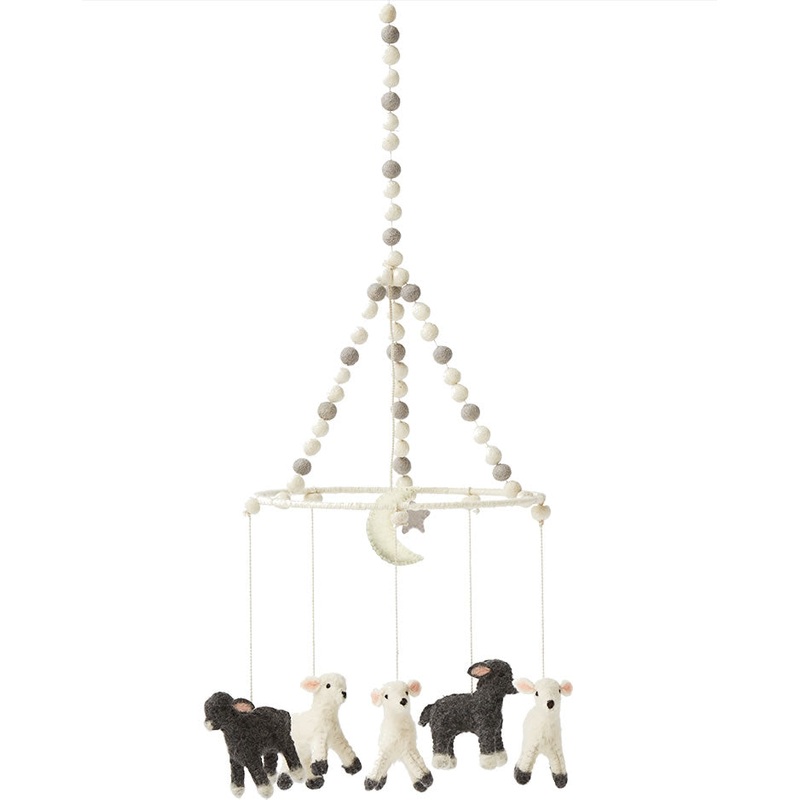 Petit Pehrs felted wool Little Lamb mobiles are a modern heirloom. Placed in a handmade giftable box, each one is carefully crafted by skilled artisans and designed to bring happiness when awake and sweet dreams while baby sleeps. This mobile has three whi