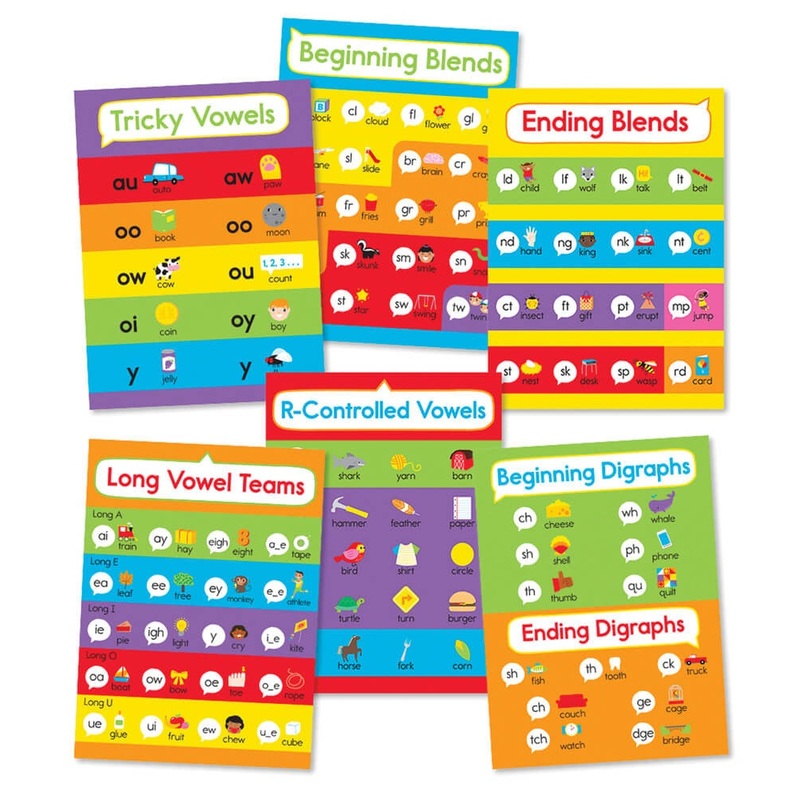Phonics Bulletin Board SetContent-rich curriculum dcor provides an effective way for students to learn essential skills in the classroom.The Phonics Chart Set includes 6 charts that cover long vowel teams, tricky vowels, beginning and ending blends, beginn
