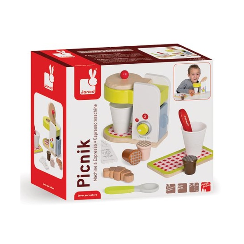 Your little ones can immerse themselves in this lifelike coffee making set designed to ignite imaginative play and aid in tactile development.Includes espresso machine with water reservoir, three coffee pods, one tray, two cups, two spoons, two packets of