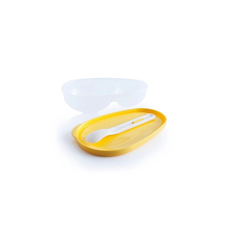 Convenient size for feeding anytime, anywhere for 6+ months baby.Dish is easy to holdSpoon clips snugly onto the inside of lid for easy storageMashing dots for grinding foodBPA FreeSterilization Method : Boiling, Steam, ChemicalMaterial : Polypropylene