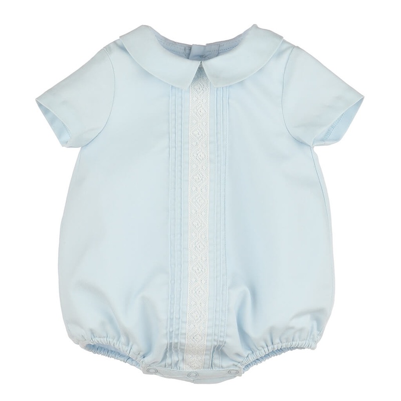 Light blue short-sleeve boy bubble. Pointed collar, plenty of pintucks, and a row of ivory lace down the center.